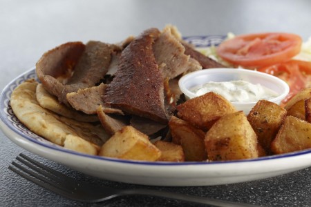 Gyro Platter A mixture of ground lamb and beef, flame-broiled and sliced into tender strips, wrapped in or served over pita Price: $13.25